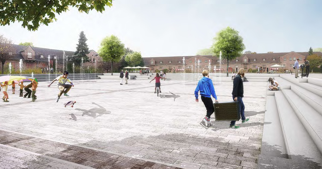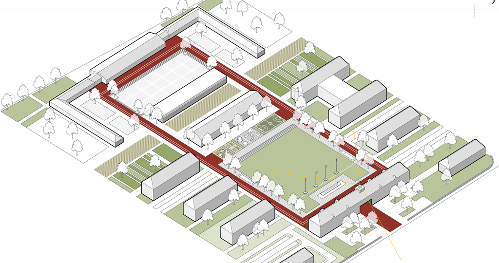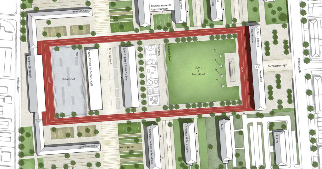 Der Campus erhält eine klare Struktur. Im Kern wird um den verbindenden LOOP ein verkehrsfreier Raum entwickelt, der vielfältige Freizeitnutzungen ermöglicht. Die umgebenden Höfe erhalten entsprechend der dort platzierten kulturellen Nutzungen klare Strukturen. Nach Norden und Süden wird der Campus durch neue bauliche Kanten gefasst.