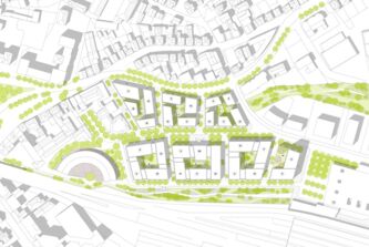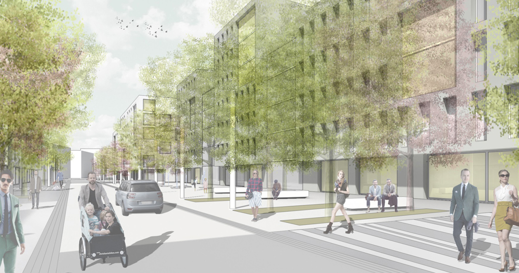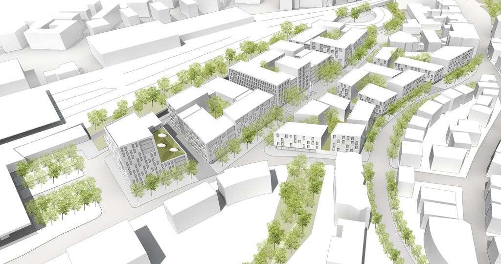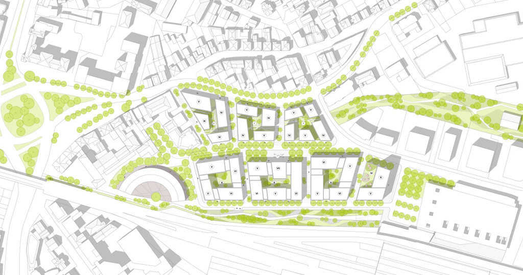 Durch das Einsetzen von Bäumen und Sträuchern entsteht ein urbaner Gartencharakter in den Höfen. Differenzierung zwischen öffentlichen Innenhöfen im Norden sowie den privaten Innenhöfe im Süden des Gebietes.