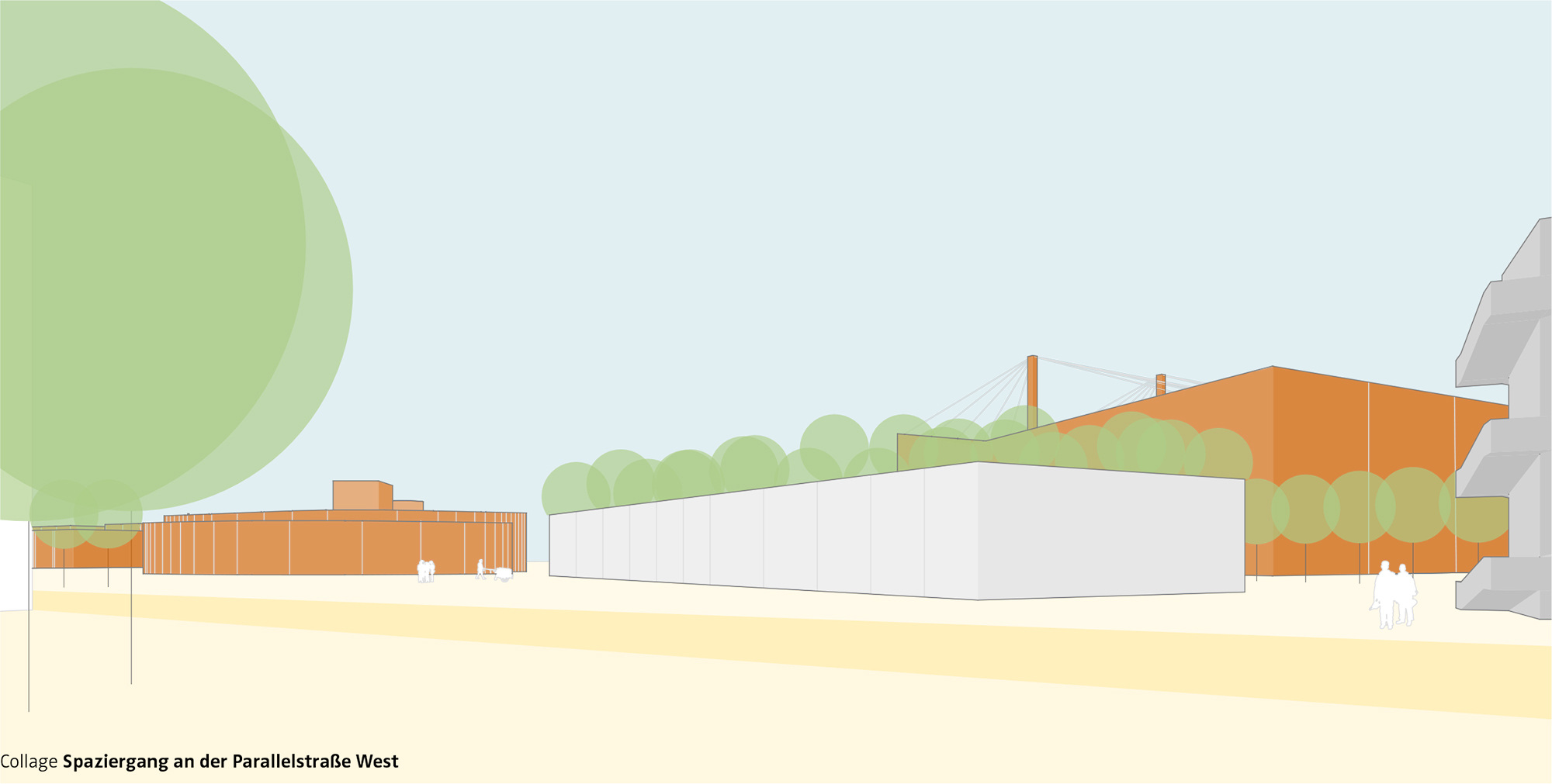 Die städtebauliche Leitidee ist es, die Besonderheit der Gesamtanlage zu stärken und diese rücksichtsvoll und dennoch wahrnehmbar zu ergänzen und abzuschließen. Ein Turm als Ende der Flughafenrandbebauung an der südwestlichen Grundstücksgrenze stellt hierbei den markantesten Baustein dar. Er gibt der linearen und repetitiven Abwicklung der bestehenden Randbebauung einen räumlichen Abschluss und erzeugt durch den Kontrast zwischen Horizontale und Vertikale eine volumetrische Spannung, die die Besonderheit der bestehenden Bandstruktur hervorhebt. Im gleichen Zuge erzeugt die städtebauliche Setzung eine eindeutige und eigenständige Adresse mit hohem Wiedererkennungs- und Repräsentationswert: sie stellt durch die Großmaßstäblichkeit eine Verbindung zu den großen Hangarvolumen her. Entlang der nördlichen Grundstücksgrenze ist eine modulare und lineare Randbebauung in Anlehnung an die denkmalgeschützten Annexbauten vorgesehen. Diese dienen ebenso wie die Annexbauten als dienende Einheiten für Hauptflächen – in diesem Fall den großen Übungs- und Multifunktionsbereichen – und schirmen die Fläche nach außen ab.