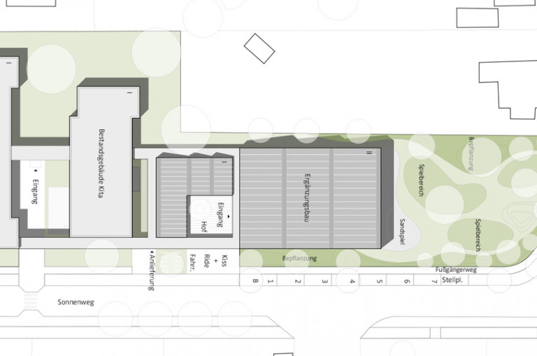 Die Freianlagen schließen mit einer Terrasse an den Neubau an. Das Grundstück wird von Rasen- und Vegetationsflächen umschlossen. Frei modellierte Spielflächen bestimmen die werden altersgerecht angeboten. Im Norden werden die Freianlagen von einem hölzernen Gerätehaus mit integrierter Außentoillette begrenzt. Kleinere und größere Baumpflanzungen spenden Schatten und ermöglichen die notwendige Intimität.