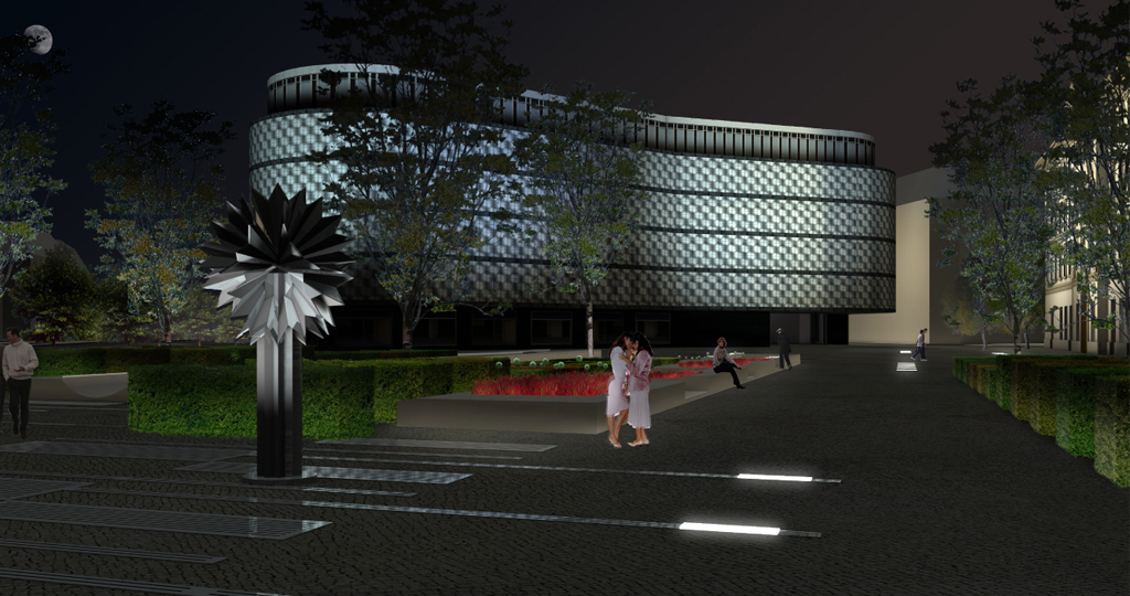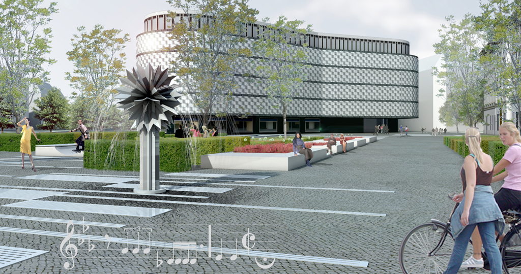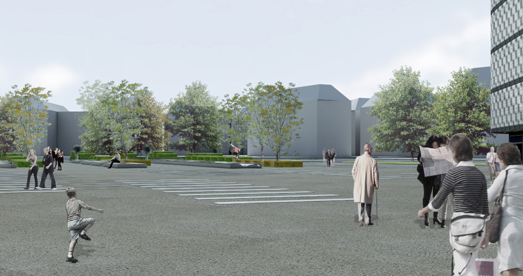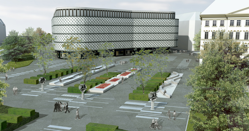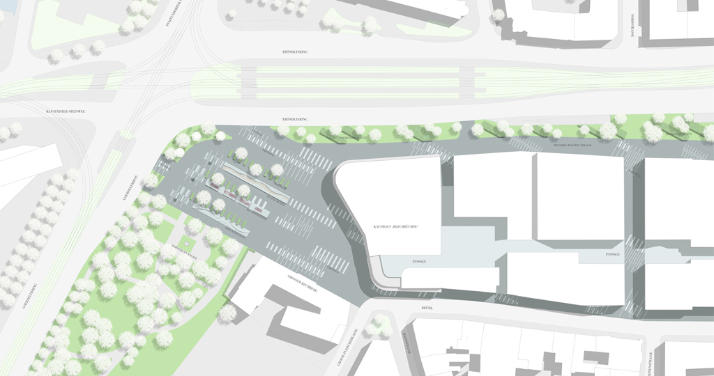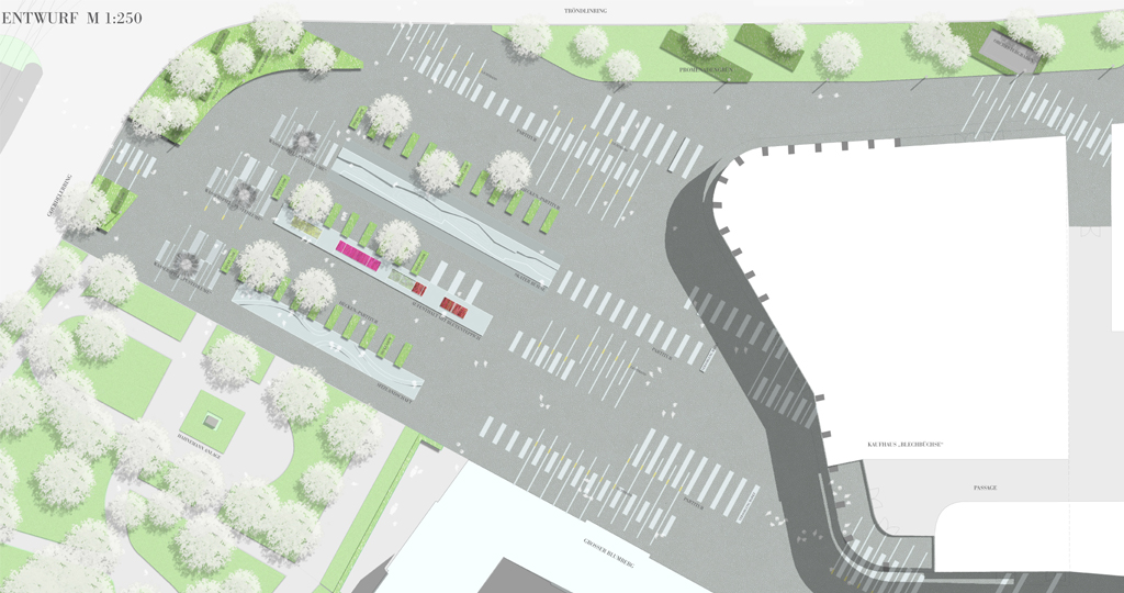 Diverse Richtungen und Personenströme kommen hier zusammen, werden aufgenommen und weitergeleitet. Der Promenadenring wird im Bereich des Platzes ergänzt und erzeugt Aufenthaltsbereiche von grünem Charakter.
