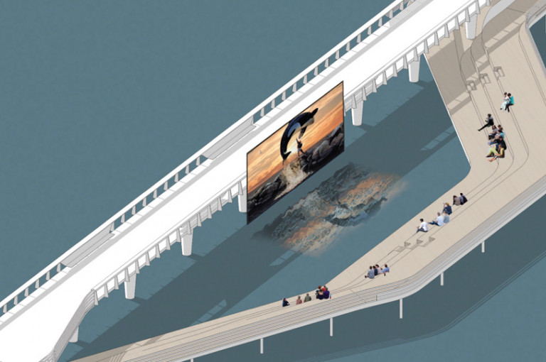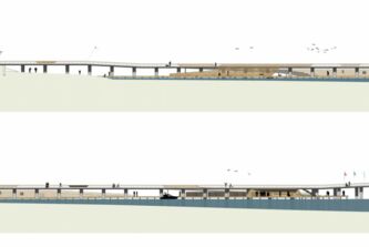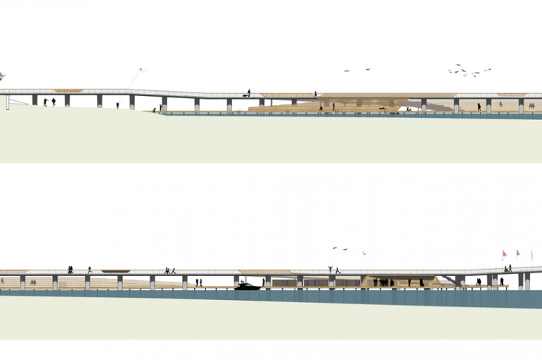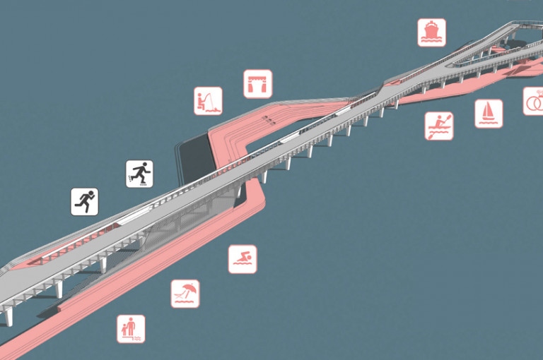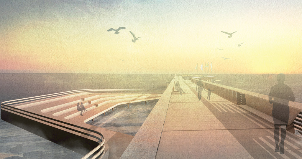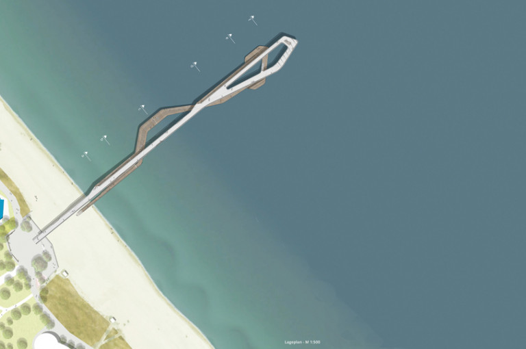 In Form und Gestalt ist die neue MARITIM Seebrücke mit ihren zwei dynamisch geschwungenen Stegen an das Sinnbild eines klassischen seemännischen Knoten angelehnt. Unterschiedliche starke Tampen/Taue ungleichen Materials, teils eng in einander Verschlungen, bilden klar ablesbare Kombinationen/Formen von Buchten, Augen sowie Rundtörns und bilden differenzierte Nutzungsbereiche, die den Anforderungen einer attraktiven, vielseitigen und zeitgemäßen Seebrücke gerecht werden.